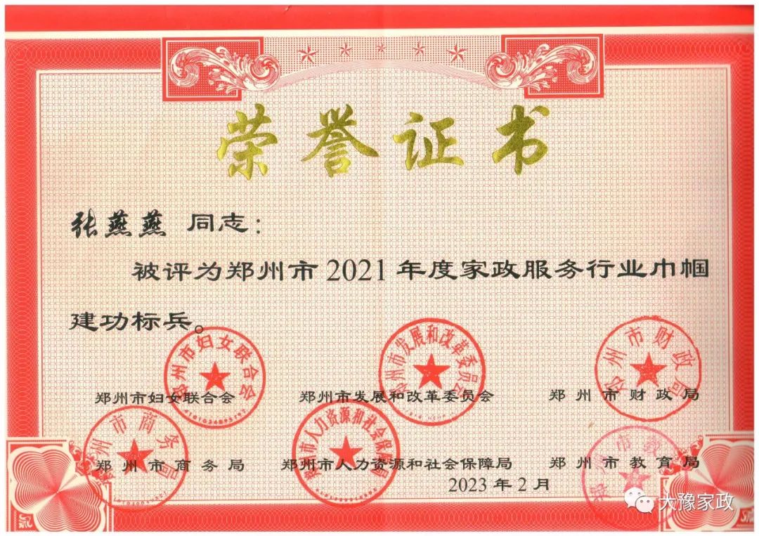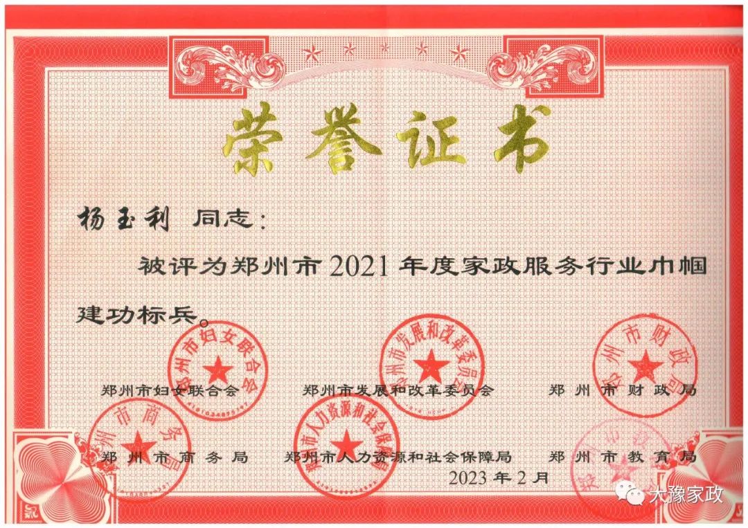 2023年3月31日,河南大豫家政服务有限公司员工杨玉利、张燕燕被郑州市妇联、发改委、财政局、商务局、人社局、教育局等单位评为郑州市2021年度家政服务行业巾帼建功标兵。