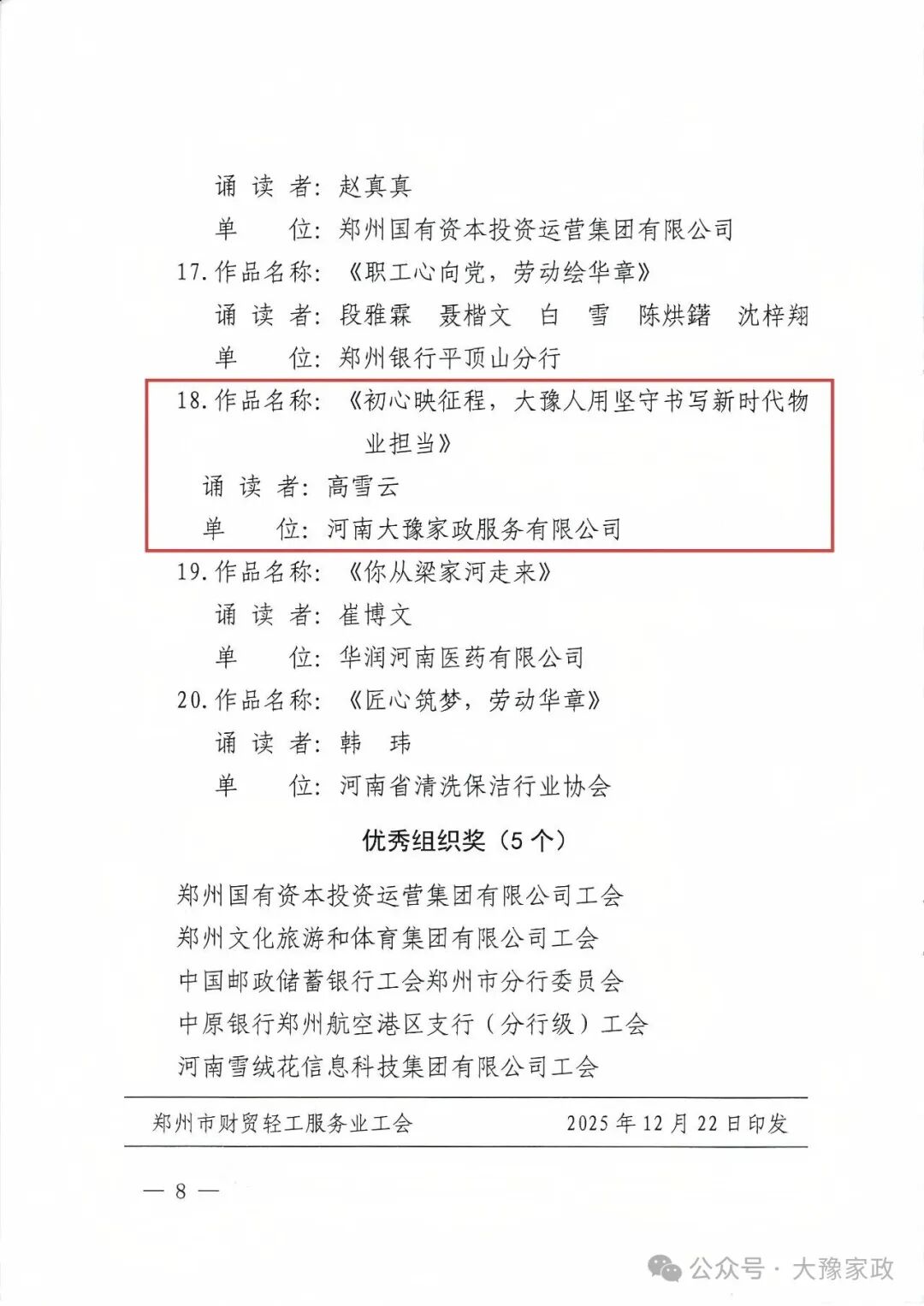 近日,郑州市财贸轻工服务业工会在全系统组织开展百名优秀职工诵读展示活动,河南大豫家政服务有限公司高雪云同志凭借扎实的语言功底与真挚的情感表达,荣获优秀奖。