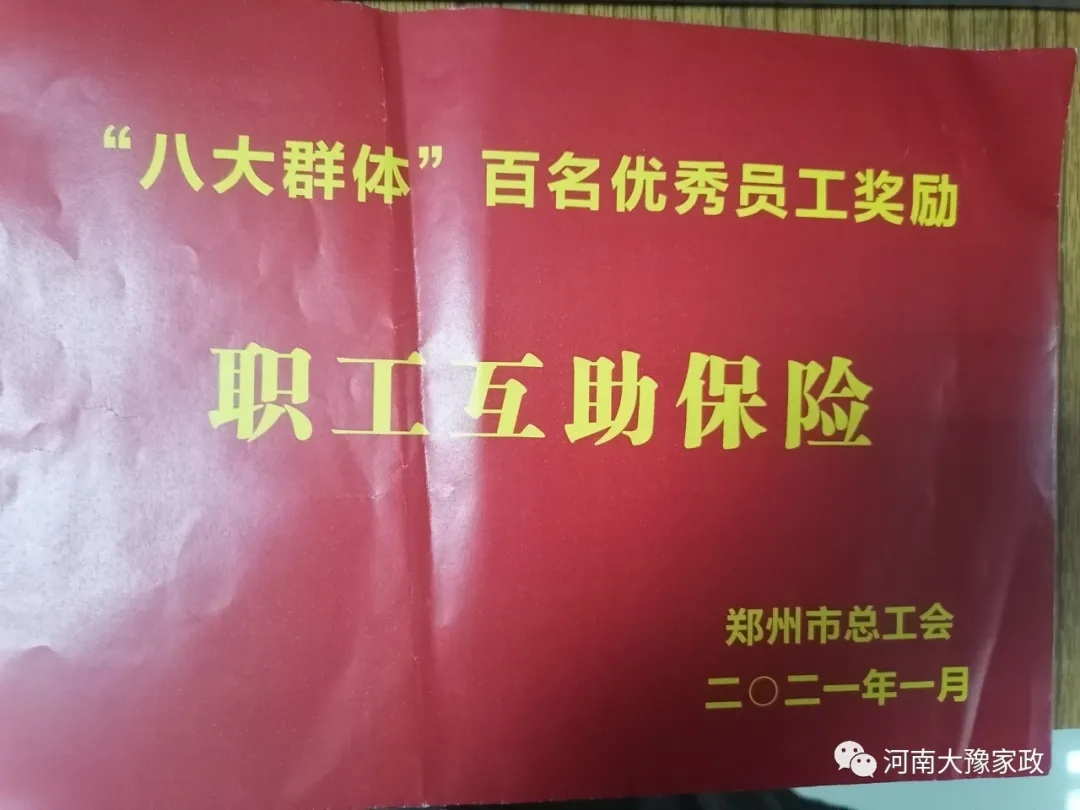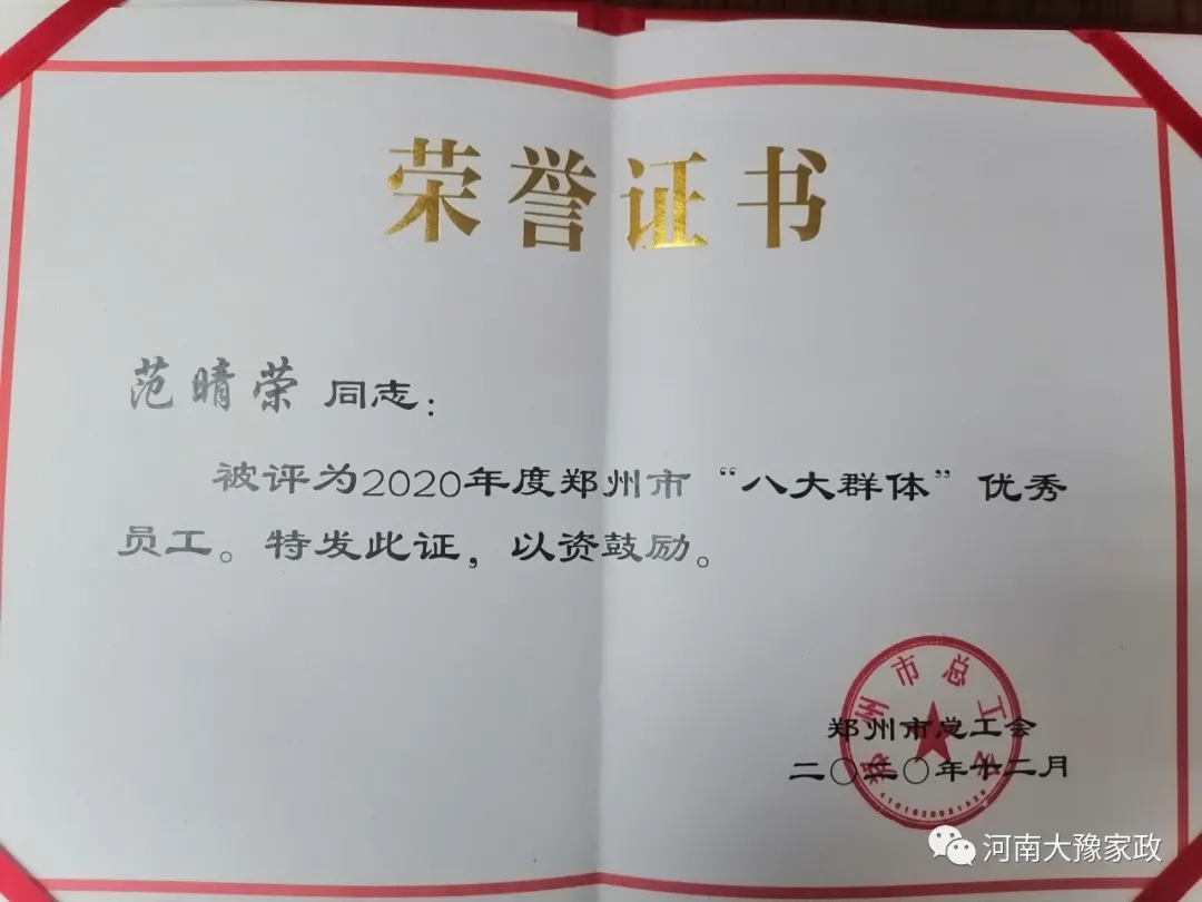 河南大豫家政服务有限公司优秀员工范晴荣被评为2020年度郑州市“八大群体”优秀员工。