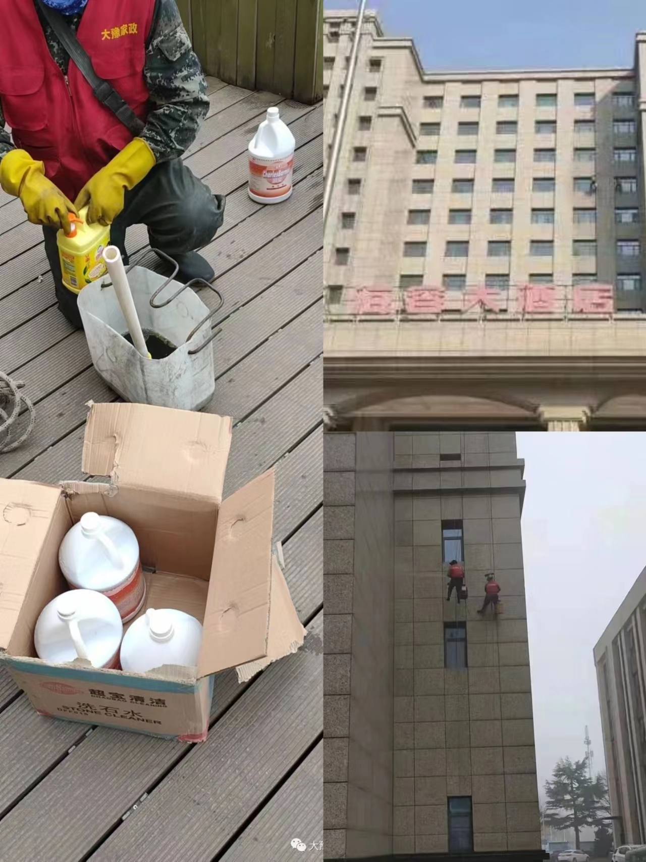 2022年3月14日,大豫家政员工在海容大酒店清洗外墙及玻璃保洁。专业的服务获得了甲方的好评。