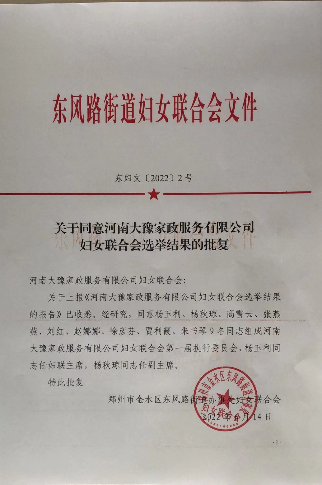 河南大豫家政服务有限公司于2022年6月14日在郑州市金水区东风路街道妇女联合会下成立了河南大豫家政服务有限公司妇女联合会。杨玉利同志被选举为河南大豫家政服务有限公司妇女联合会的主席,杨秋琼同志当选为副主席。