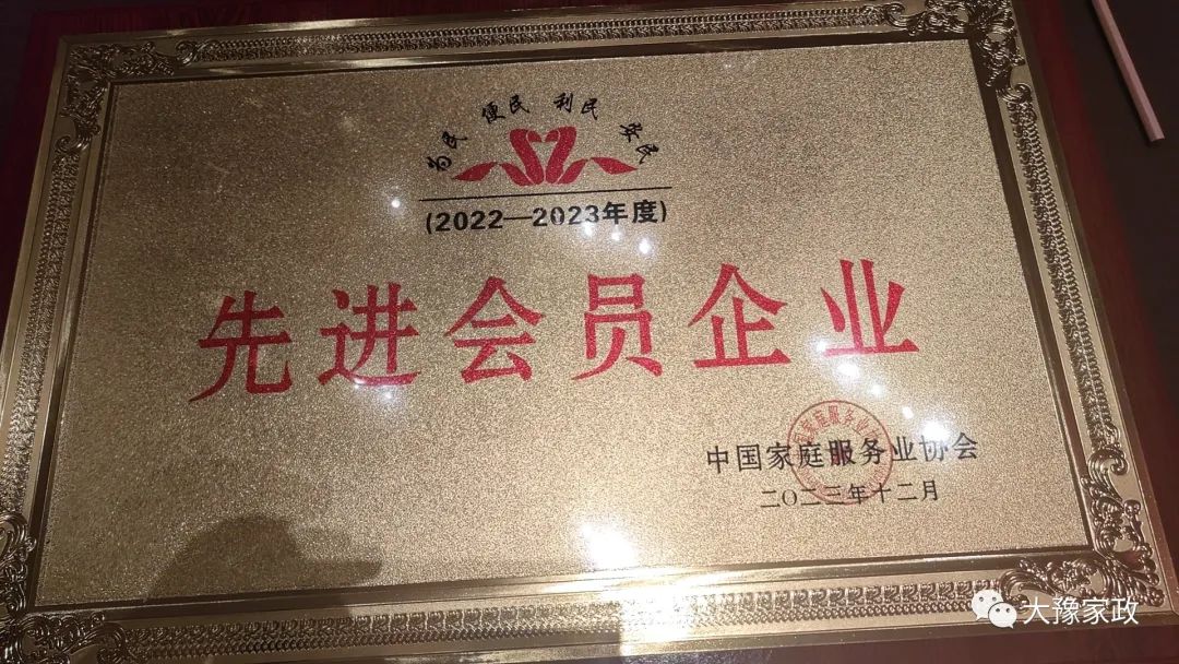 河南大豫家政服务有限公司获得中家协颁发的2022-2023年度“先进会员企业”。
