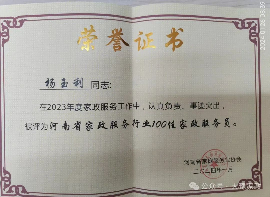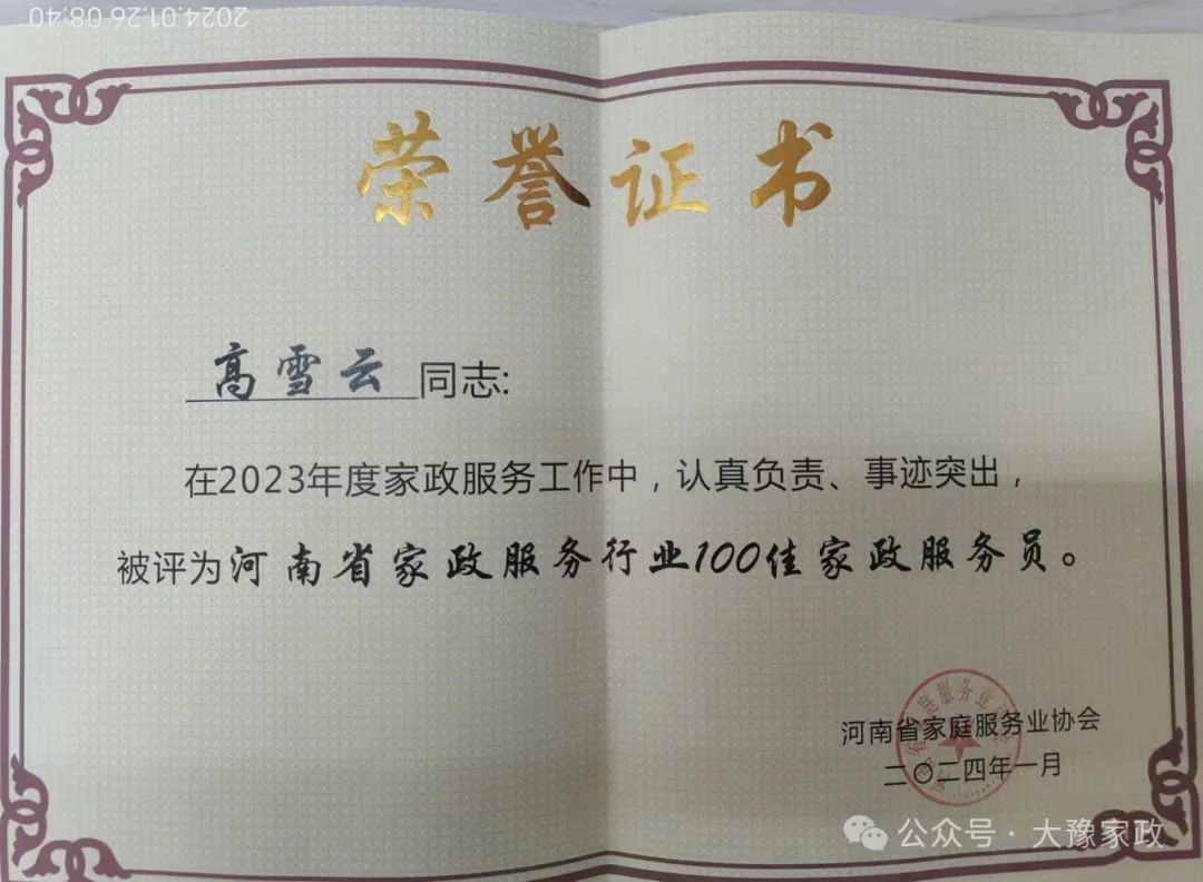 大豫家政员工高雪云、杨玉利被评为“河南省家政服务行业100佳家政服务员”