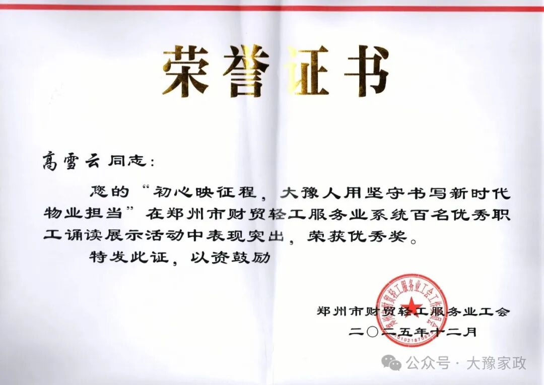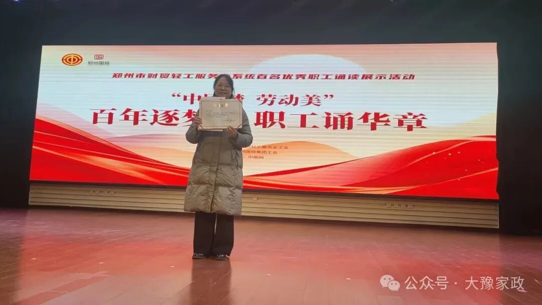 近日,郑州市财贸轻工服务业工会在全系统组织开展百名优秀职工诵读展示活动,河南大豫家政服务有限公司高雪云同志凭借扎实的语言功底与真挚的情感表达,荣获优秀奖。